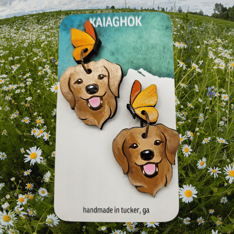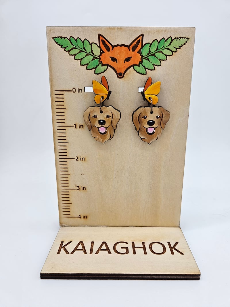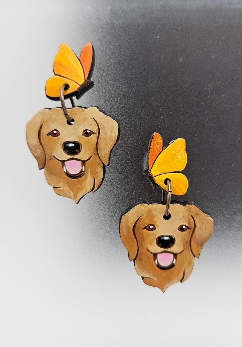 Lovingly hand-painted Golden Retriever and butterfly earrings.